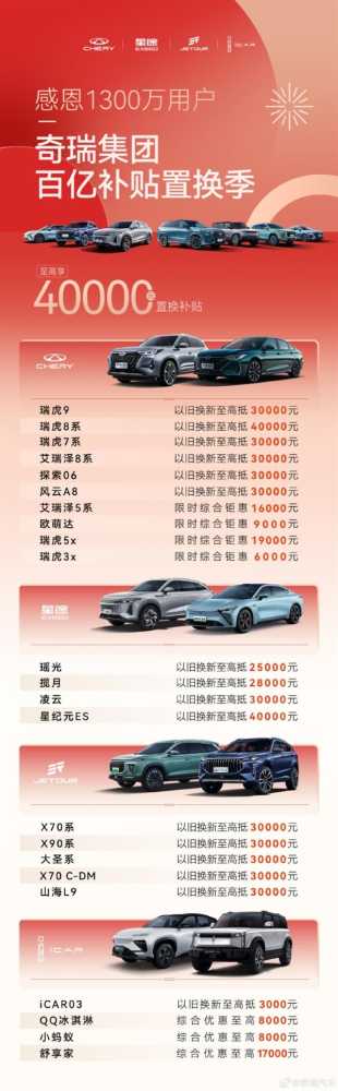 此外,还有个别车型置换力度详见下图。总体来看,奇瑞集团此次推出的百亿补贴力度较大,优惠金额多,用户可根据实际情况来选择。