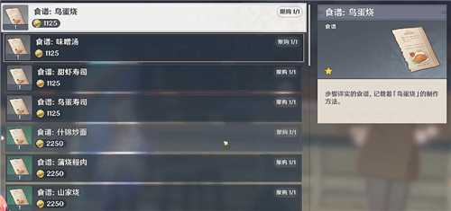 然后他这里的第一个食谱,就是鸟蛋烧,花费1125个摩拉,就能直接购买。
