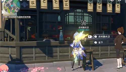 首先来到稻妻的传送锚点,然后走到冒险家协会对面的餐馆这里,和志村屋村长对话。