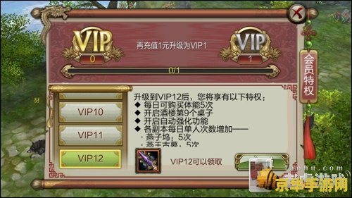 VIP特权系统不仅为玩家提供了更多的游戏资源和便利,更让玩家在游戏中感受到尊贵和荣耀,这些特权不仅提升了玩家的实力,也让玩家在江湖中更加自信和从容,VIP特权也为玩家之间的互动和社交提供了更多可能性,让游戏世界更加丰富多彩。
