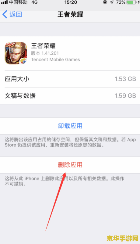4、清理缓存:在《王者荣耀》的详情页面中,可以看到应用占用的存储空间以及缓存数据的大小,点击“卸载应用”或“删除应用”按钮(注意不是“删除数据”),然后重新从App Store下载并安装《王者荣耀》,这样,缓存数据就会被清理掉,而游戏数据(如角色、装备等)则会保留。