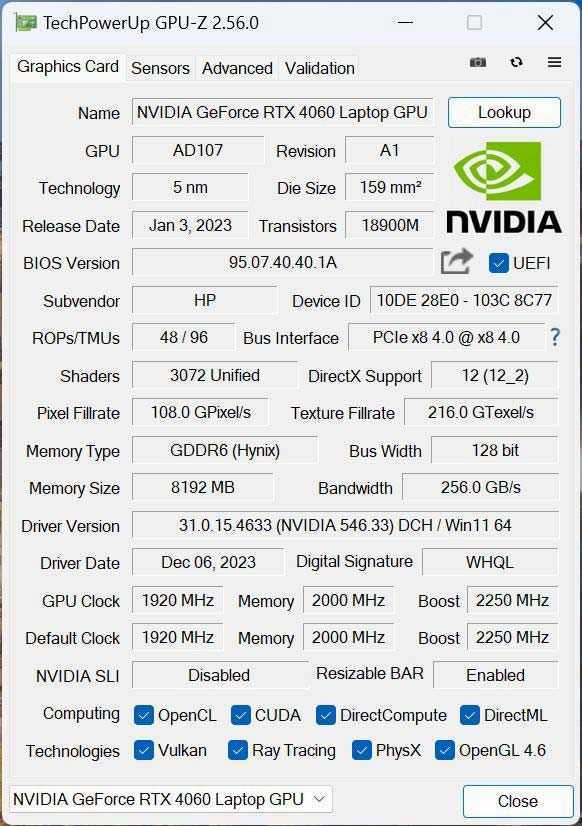 接下来看一下显卡。RTX 4060 Laptop是大家非常熟悉的一款显卡,拥有3072个CUDA核心,核心频率1920MHz,Boost频率2250MHz;显存8GB GDDR6,显存频率2000MHz。