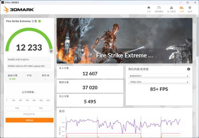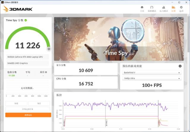 3DMARK实测得到,Time Spy模式下总分为11226,显卡分为10609;Fire Strike Extreme模式下总分12233,显卡分12607。从测试结果来看,RTX 4060 Laptop的性能表现正常,属于目前移动平台的中端水平,应对主流3A游戏完全没有问题。