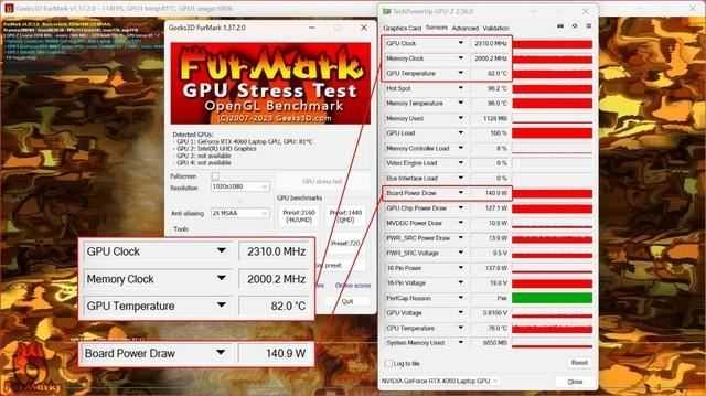 在性能释放方面,使用Furmark进行测试,设置为1080P+2XMSAA。30分钟后,RTX 4060 Laptop的功耗稳定在140W,此时核心频率2310MHz,显存频率2000MHz,核心温度82℃。140W意味着暗影精灵10的显卡是满功耗的,性能表现无需担心。