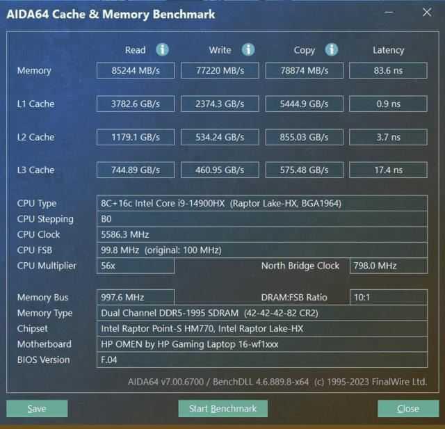 暗影精灵10采用了英特尔最新14代酷睿HX处理器,型号为i9-14900HX。由于是全新一代处理器,所以软件识别并不完全准确。i9-14900HX的规格非常给力,拥有与桌面14代i9相同的24核心32线程,由8个性能核和16个能效核组成,最高睿频可达5.8GHz,三级缓存36MB,默认TDP为55W。相比上一代i9-13900HX,i9-14900HX的睿频更高。