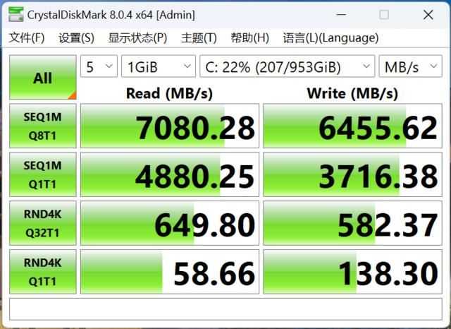 硬盘实测持续读取7080MB/s、写入6455MB/s;4K随机读取58.66MB/s,写入138.3MB/s。持续读取的成绩非常给力,表明这块固态硬盘是PCIe 4.0中的旗舰定位,加载游戏会更快。