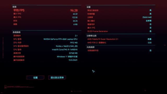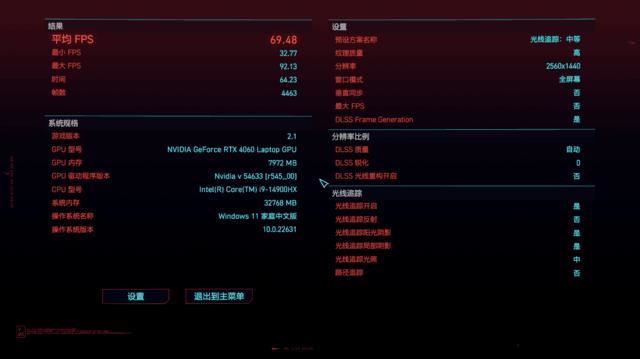 《赛博朋克2077》在两个画质下进行测试,分别为系统预设的高和光线追踪:中等,体现光栅性能和光追性能。在高画质下,Benchmark平均成绩为96.28帧,流畅游玩完全没有问题;在光线追踪:中等设置下,Benchmark平均成绩为69.48帧,超过了60帧,意味着即使在2560×1440的光追画质下,暗影精灵10仍旧可以提供流畅的游戏体验。