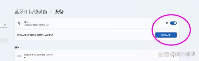6、点击蓝牙和其他设备>设备页面蓝牙选项后面的“添加设备”: