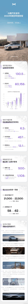 对于2024年第一季度,小鹏汽车预期汽车交付量将介乎21000至22500辆之间,同比增长约15.2%至23.4%,总收入在58亿元至62亿元,同比增长约43.8%至53.7%。