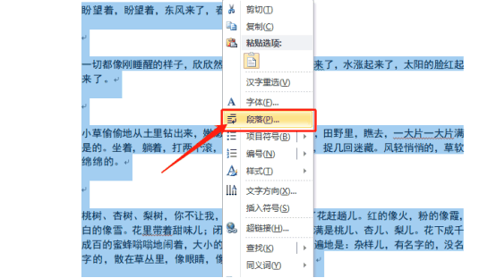 4、然后,我们用鼠标右键点击【word文档】;这时候,会在显示的下拉菜单里面点击【段落】的按钮。