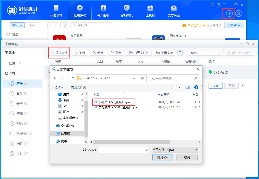 如果已拥有应用的安装包,可以通过PC端将软件安装到设备中:连接移动设备到电脑后,进入“下载中心”,在弹出框中选择“添加文件”,选择想要安装的应用的ipa包后将该应用安装到设备。