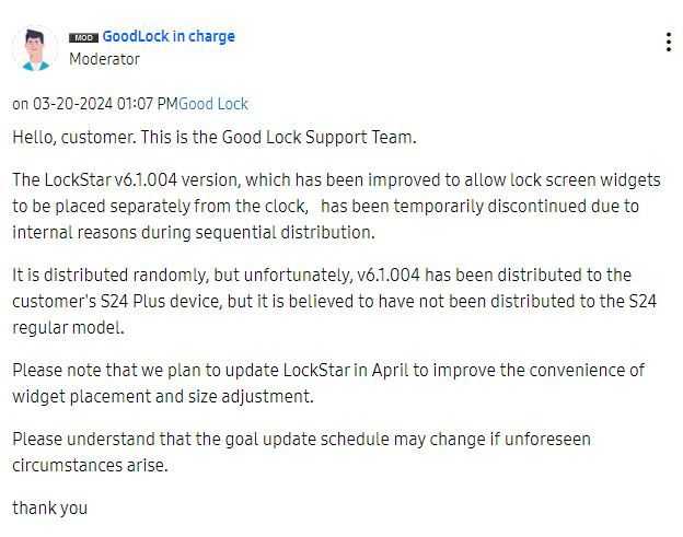 社区版主表示 LockStar 模块原本应该是按照顺序推送更新的,但在实际推送过程中却会出现随机情况,例如 Galaxy S24 Plus 收到更新,但是标准版 S24 没有收到。三星社区版主表示已经意识到了这个问题,并计划在 4 月重新发布更新,以改进锁屏界面上部件的位置和大小调整。