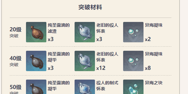 20级:纯圣露滴的滤渣5、老旧的役人怀表5、异海凝珠5;