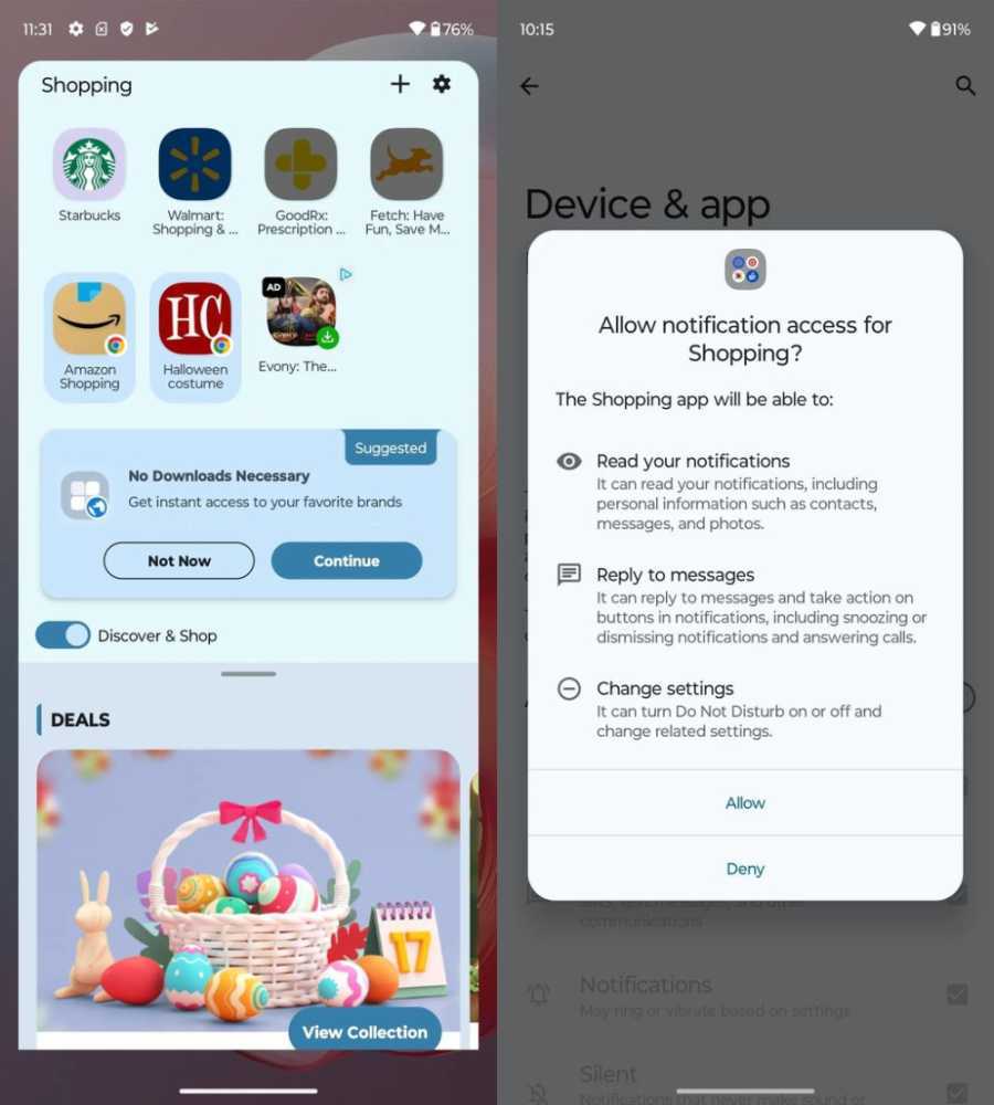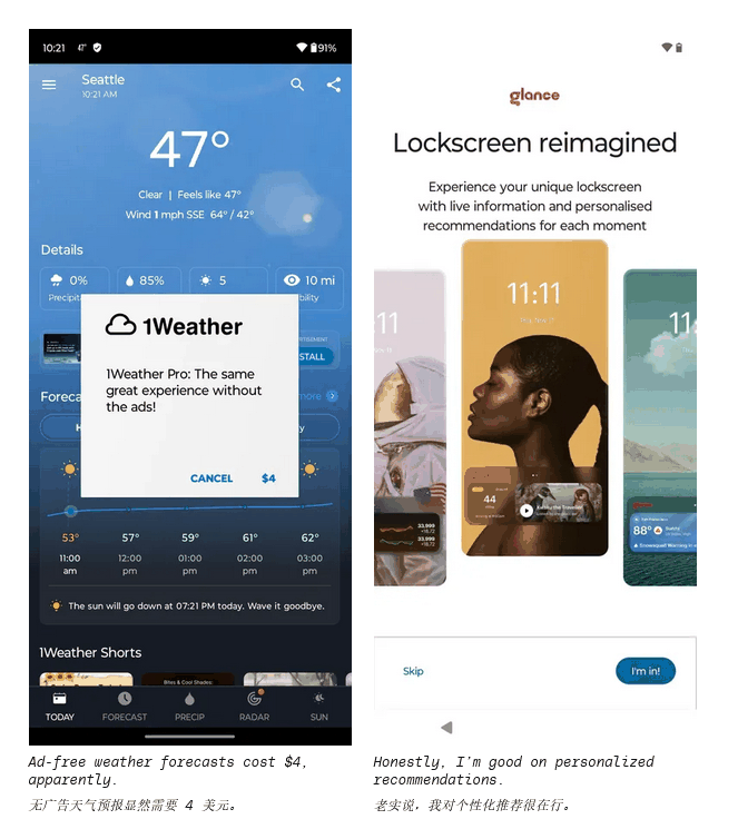 用户合法下载的应用图标会出现在对应的“文件夹”中,用户打开“文件夹”会看到大量推广应用程序。用户在取消推荐应用之后,系统会替代上线“探索”(Discover)部分,例如在 Shopping 应用中邀请你“释放购物的力量”(Unlock the power of shopping),植入从 TJ Maxx 购买复活节装饰品的链接。这些应用程序都是由一家名为 Swish 的公司制作的,在设置过程中你无法选择不下载其中任何一款。预装的天气应用程序充斥着广告和更多的推荐应用程序,如果你点击删除广告的选项,弹出窗口会要求你支付 4 美元购买 1Weather Pro。