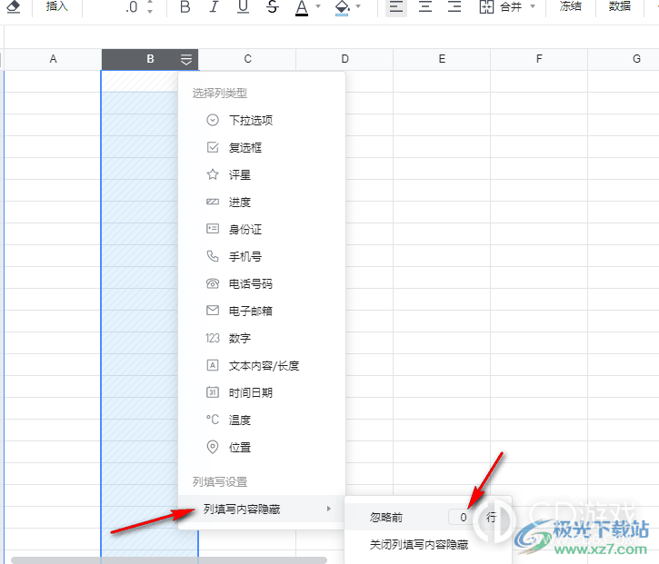 3、第三步,设置好填写内容隐藏之后,我们在该列中输入的所有内容就会自动隐藏了,我们再点击列头中的图表,然后在下拉列表中点击“列填写内容隐藏”选项,然后在子菜单列表中还可以设置忽略前面几行