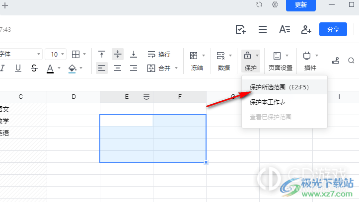 4、第四步,我们也可以选中单独几个单元格,然后在工具栏中点击打开“保护”选项