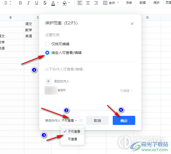 6、第六步,进入保护范围的设置页面之后,我们先将权限设置为“指定人可查看/编辑”,然后将“其它协作人”设置为“不可查看”,最后点击确定选项即可
