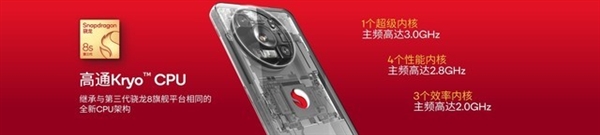 第三代骁龙8s由4nm工艺制程打造,采用第三代骁龙8旗舰平台相同的CPU架构,拥有一颗Cortex-X4超大核,主频高达3.0GHz,四个性能内核Cortex-A720,主频高达2.8GHz,以及三个效率内核A520,主频2.0GHz。