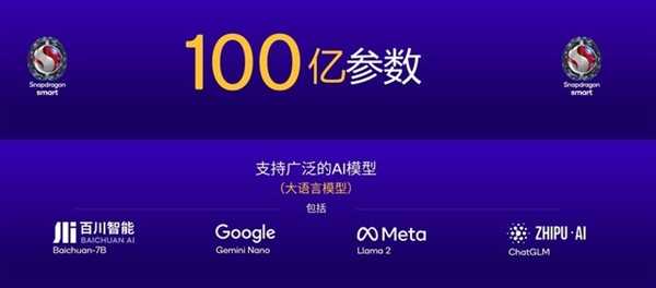 从参数支持来看,第三代骁龙8s可以支持高达100亿参数级别的大语言模型。并且该平台还支持更为广泛的AI大模型,其中包括Baichuan-7B,Google Gemini Nano、Llama2和ChatGLM等等,十分广泛。