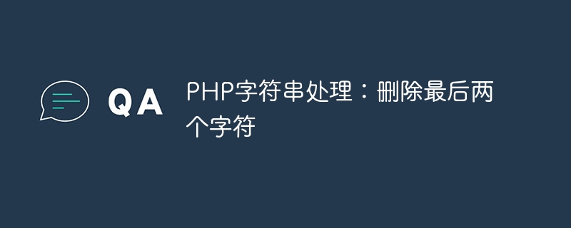 <?php // 定义初始字符串 $str = "Hello, World!"; // 取字符串长度 $length = strlen($str); // 删除最后两个字符 $newStr = substr($str, 0, $length-2); // 输出删除后的字符串 echo $newStr; ?>
