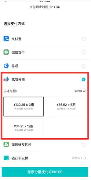 5、最后在付款的页面,勾选【花呗分期】后方的按钮,选择分期类型即可完成。