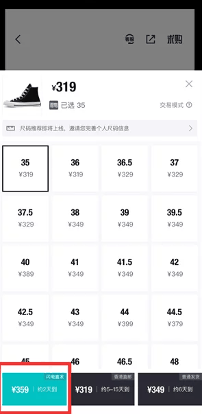 3、然后选择合适的码数,点击左侧的价格;