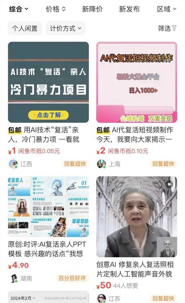 某二手交易平台上,我一搜 “ AI 复活 ” ,立马就跳出来不少服务。