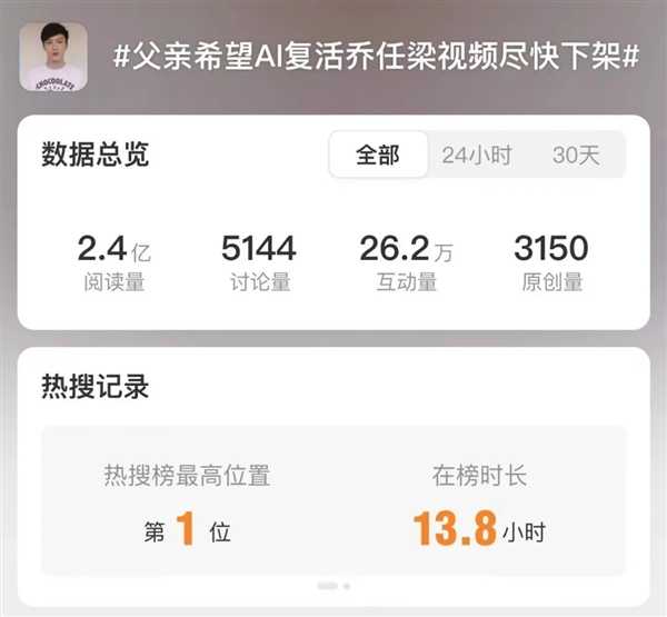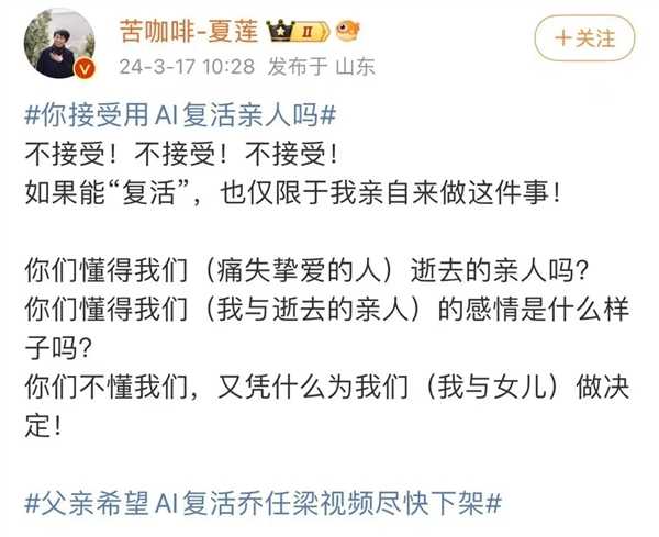 视频一发出来, # 父亲希望 AI 复活乔任梁视频尽快下架 # 的话题直接冲上了热搜第一。 “ 吃人血馒头 ” “ 消费逝者 ” “ 为了流量不择手段 ” 之类的论调更是不绝于耳。