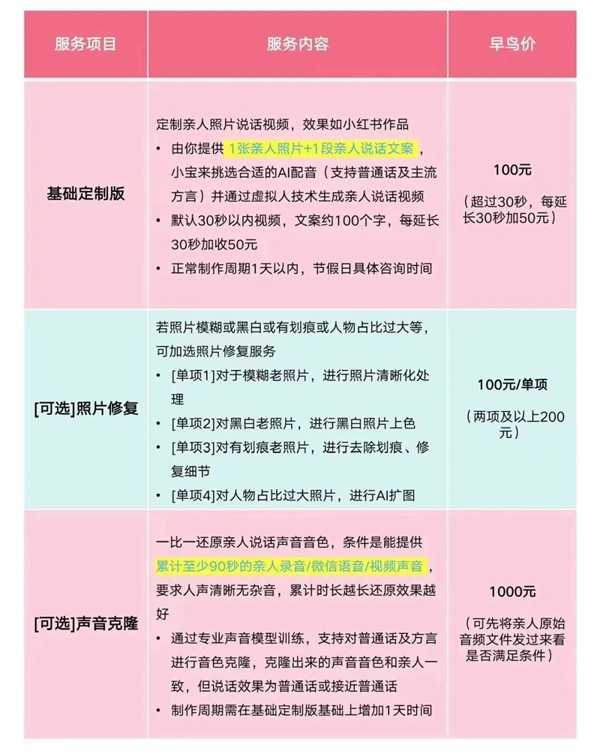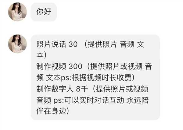 报价从十几块到上千元不等,像某家数字亲人视频定制服务,一个 30s 的视频收 100 块,多出来的时间还要加钱,照片修复 100 块一张,声音克隆甚至要价到 1000 块。