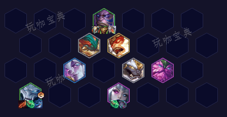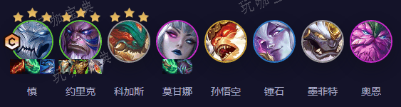 阵容基石角色包括慎、约里克、科加斯、莫甘娜、孙悟空、锤石、墨菲特和奥恩,他们共同构建了一个具有多重羁绊协同作用的坚实阵型。