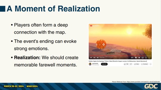 《原神》是一款注重运营及生命力的产品,想要传达的是一种普世美好的价值观。演讲的最后李轶轩表示,“与玩家珍贵的记忆产生共鸣,看到玩家在社区中热烈讨论他们在探索限时地图时发现的隐藏线索、享受拼凑完整故事的乐趣,这正是我们想要通过夏日限时活动地图带给玩家的意外惊喜。”