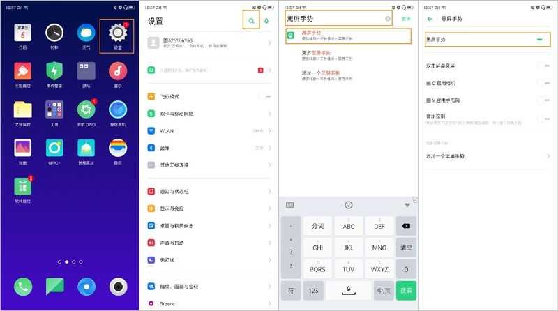 通过桌面的设置打开,点击搜索栏输入想查找的功能,这里以【黑屏手势】为例,输入【黑屏手势】,点击相应出现的内容进入,即可进入相应设置界面。