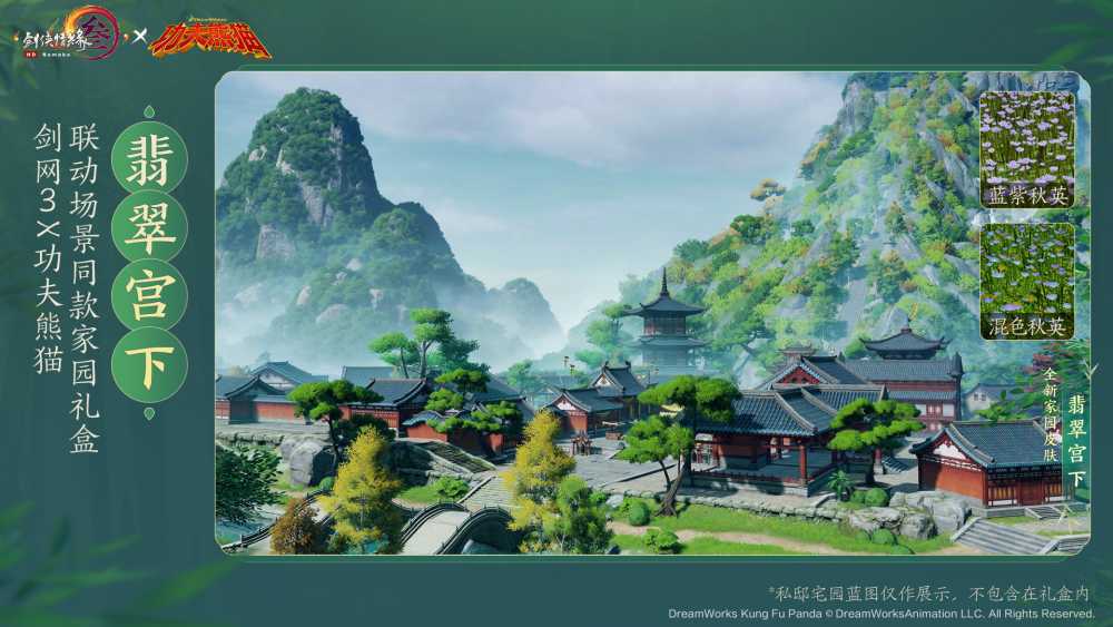 礼盒包含:主题私邸宅园皮肤·翡翠宫下+50个景观类家具混色秋英+50个景观类家具蓝紫秋英3月25日7:00至4月29日7:00限时上架,可享受8折优惠,折后价38,400通宝,为绑定款,不可使用折扣券。礼盒内商品亦可在3月25日7:00至4月29日7:00单独选购,均为绑定款。私邸宅园皮肤“翡翠宫下”:售价38,000通宝,不可使用折扣券。景观类家具“混色秋英”礼盒:内含50个景观类家具混色秋英,售价5,000通宝,首周可享八折优惠。景观类家具“蓝紫秋英”礼盒:内含50个景观类家具蓝紫秋英,售价5,000通宝,首周可享八折优惠。