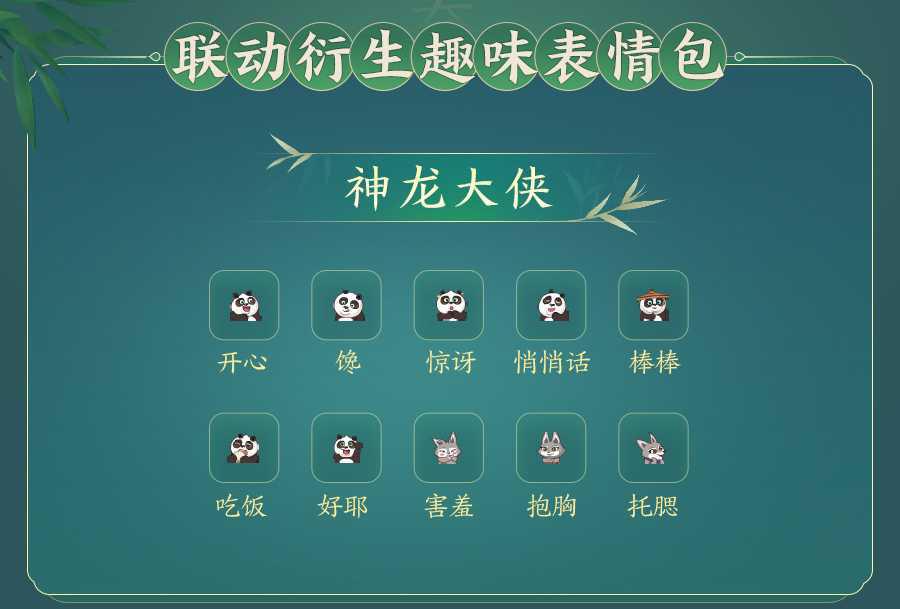 联动衍生趣味表情包:3月25日20:10至4月29日7:00限时上架,每套售价1,800通宝,不可使用折扣券。