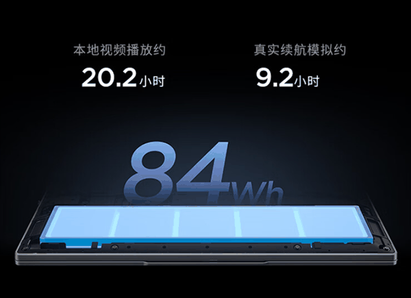 联想小新Pro14 2024牺牲了一定便携性的前提下,配备了84Wh电池,本地视频播放约20.2小时,真实续航模拟约9.2小时。