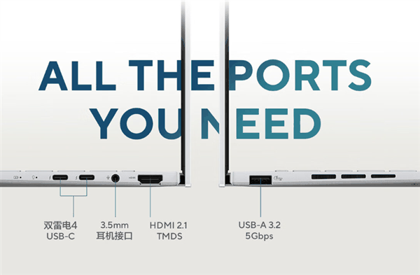 在接口方面,华硕灵耀14 2024在薄至13.9mm的轻薄机身上提供了2 x 雷电4 USB-C、1 x USB-A 3.2 Gen1、1 x HDMI 2.1 TMDS、1 x 3.5mm耳机接口,这是非常不可思议的。