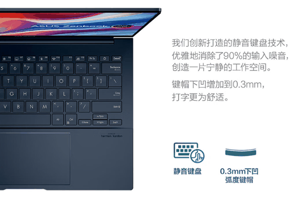 华硕灵耀14 2024的键盘采用了创新的静音键盘技术,能够消除90%的输入噪音,工作更安静。同时键帽下凹增加到0.3mm,打字更为舒适。