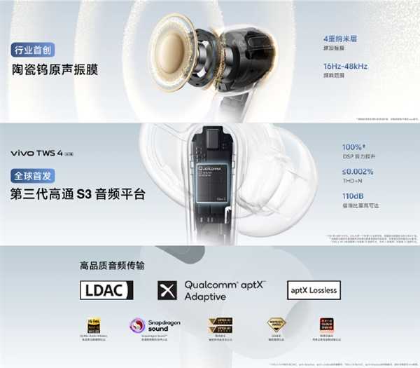 据悉,vivo TWS 4系列首创陶瓷钨原声振膜,出色的高频再现,近无的谐振失真,优异的瞬态响应,高温下声学稳定,以及更耐磨更耐腐的使用寿命,宣称“对TWS系列具有里程碑的意义”。