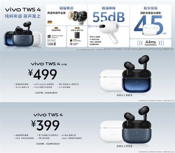 售价方面,vivo TWS 4 Hi-Fi版首发499元,vivo TWS 4首发399元。