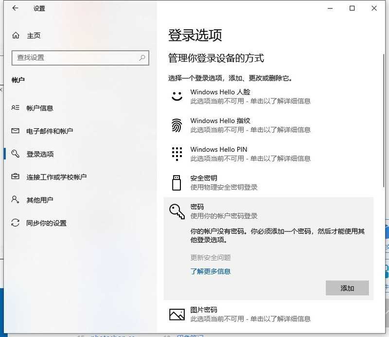 4、找到密码选项,点击【添加】。