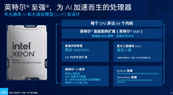 与使用相同内置AI加速技术(AMX,高级矩阵扩展)的前一代,也就是第四代至强? 可扩展处理器相比,它深度学习实时推理性能提升高达42%;与内置上一代AI加速技术(DL-Boost,深度学习加速)、隔辈儿的第三代至强? 可扩展处理器相比,AI推理性能更是最高提升至14倍。