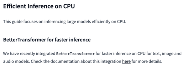 而且也正如我们刚才所提到的,从Hugging Face所提供的优化教程来看,只需要简单的几步,就可以让CPU快速部署用于高效推理。