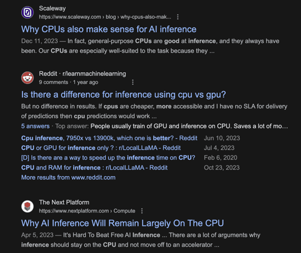 就这样,在GPU及其他专用加速芯片一统AI训练天下的时候,CPU在推理,包括大模型推理这件事上似乎辟出了一条“蹊径”,而且与之相关的讨论热度居然也逐渐高了起来。