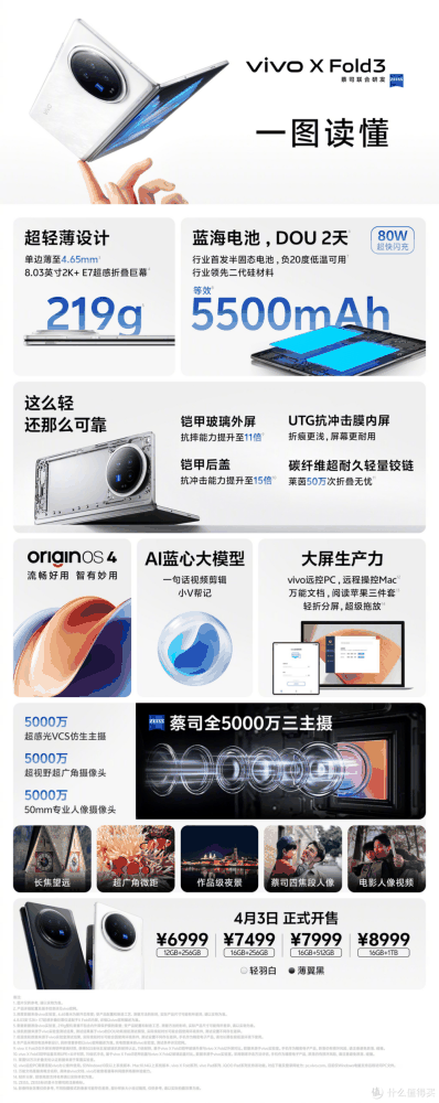 该机采用Q9+外屏、三星E7内屏、LPDDR5X运存、UFS4.0内存、无线无损HiFi、红外遥控等配置,以及后置高像素三摄组合,值得提及的是vivo X Fold3 Pro三摄组合中包括了一颗6400万像素的蔡司潜望超级长焦摄像头,能轻松拍摄远景和长焦微距,可玩性高。而关键零部件芯片方面,vivo X Fold3搭载第二代骁龙8 SPU,vivo X Fold3 Pro搭载第三代骁龙8 SPU,它们都有着同级别同价位段优秀的性能体验,可以流畅运行日常所有的手机应用,搭配全新升级的OriginOS系统和AI大模型,带来智能高效的上手体验。