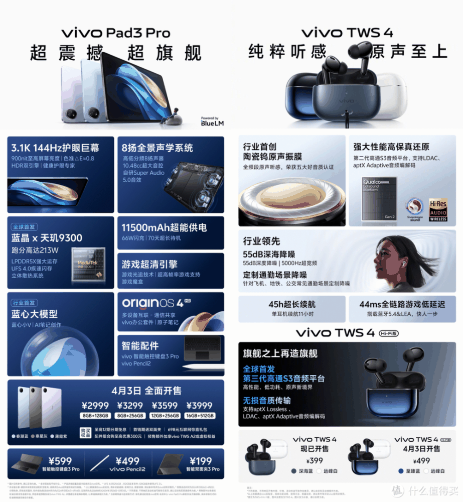 有意思的是,这次vivo还同步推出vivo Pad3 Pro平板和vivo TWS 4系列真无线蓝牙耳机,前者拉高生产力属性,后者实现更出色的降噪效果,值得上手体验。