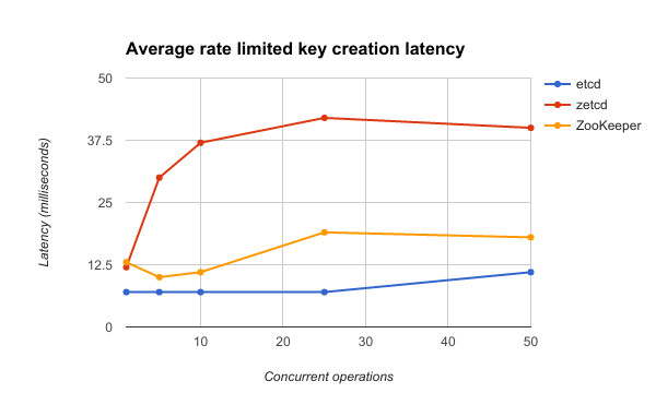 下图揭示了zetcd客户端并发数与创建key的平均延迟之间的关系。由于etcd在延迟上比ZooKeeper要有5-35ms的优势,zetcd有足够余地处理由于额外负载和网络跳转造成的延迟。比起ZooKeeper,zetcd代理始终还是存在20ms左右的差距,但是从处理2500请求的吞吐量数据来看,并没有出现队列堵塞。一种对zetcd写比较慢的解释是,与读不一样,由于数据模型上存在差异,所以在每个ZooKeeper key写时需要写多个key。