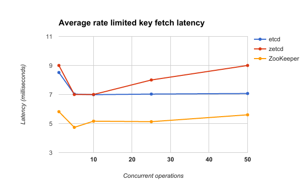 下图揭示了zetcd客户端并发数与key取值的平均延迟之间的关系。由于ZooKeeper的取值延迟比etcd要快那么2ms左右,想要zetcd提供数据的速度快过ZooKeeper的话恐怕还得依赖于etcd本身性能的进一步提升。然而,尽管zetcd需要从etcd请求额外的key来模拟Zookeeper znode的元数据,zetcd的命中延迟在等待etcd key提取数据方面只增加了大概1.5ms。zetcd在key的数据提取操作方面仅需一次往返,因为读请求会被打包到一个etcd事务中。
