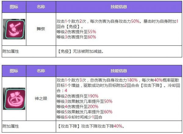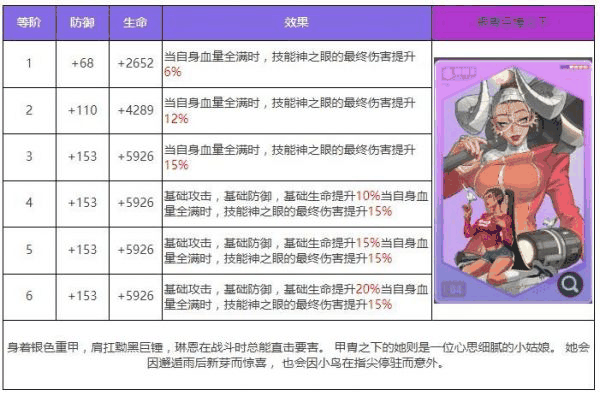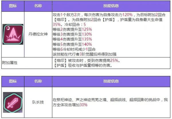 琳恩是一个集驱散、攻击下降、免疫和护盾于一体的攻击型代行者。琳恩的神之眼将对敌方1个目标发起3连击,每次攻击有一定概率驱散目标1个增益状态,如果驱散成功,则额外对目标附加2回合“攻击下降”效果。丹德拉女神在对单体敌人造成大量伤害的同时,可以为自身附加一定回合数的护盾并为目标附加烙印效果,如果这次攻击暴击,则会增加此次伤害和护盾值,并提升自身行动值。