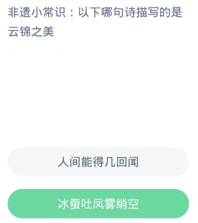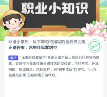 解析:冰蚕吐凤雾绡空是明末清初诗人吴梅村对云锦的赞美,云锦是我国传统丝织技艺的佼佼者,用料考究、色泽绚丽、织造精美、纹饰吉祥,有锦中之冠的称号。