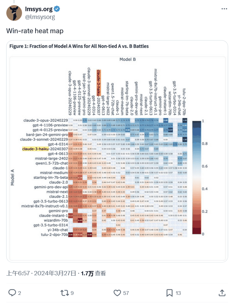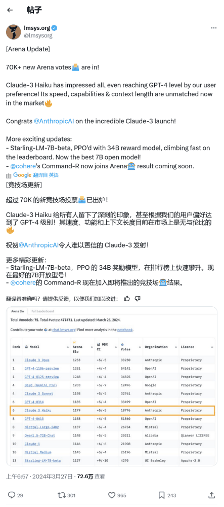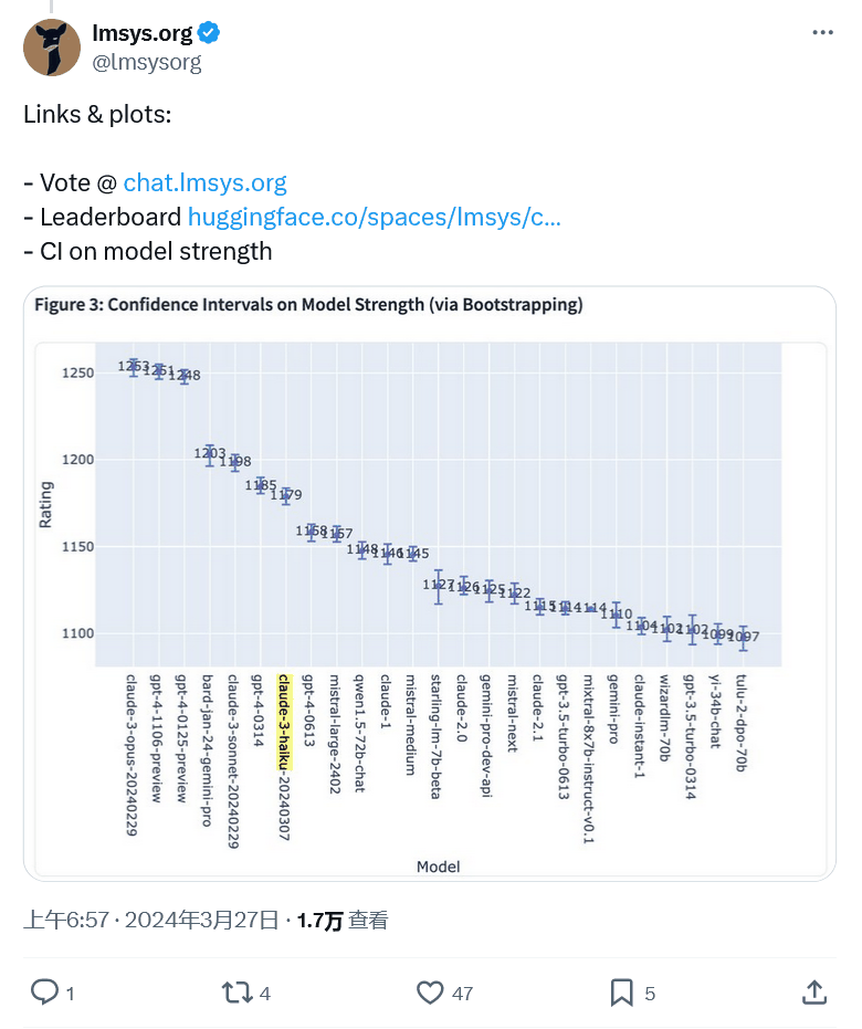 它比拥有数万亿参数的 Opus 要小得多,因此相比之下速度要快得多。根据 LMSYS 的数据,Haiku 在排行榜上名列第七,有媲美 GPT-4 的表现。
